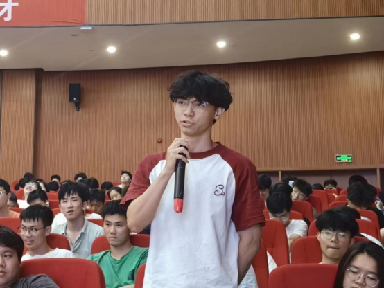 之后,陈文君校友分享了自己的职业发展历程。从新人到行业领军者,他用自己的真实经历激励大家:唯有坚持不懈的学习与努力,才能在激烈的职业竞争中脱颖而出。陈文君校友还对职场经验进行了分享,并提出了宝贵建议。他鼓励同学们保持对工作的热情与好奇心,勇于迎接新的机遇和挑战。分享结束后,陈文君校友与大家深入交流讨论,针对同学们提出的有关未来生活规划、当前就业所需条件等问题,给予了耐心且详尽的解答。