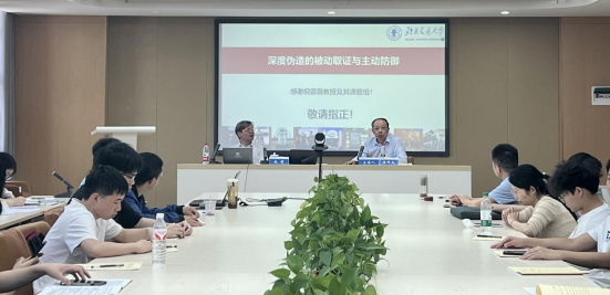 赵耀教授首先介绍了深度伪造取证的研究背景,他指出,随着人工智能的不断发展,深度伪造也随着产生,AI生成合成和伪造的手段也越来越多,例如,图片、视频换脸等。因此,为了避免深度伪造带来的不利影响,深度伪造检测技术的研究具有重要意义。然后,赵教授详细介绍了AI深度伪造取证的主要方法,例如,梯度伪影特征、泛化性伪造自适应学习、多模态对比学习、伪造概念注入、可解释鉴伪大模型。接下来,赵教授还介绍了生成式人脸编辑的主动防御,包括基于警示性图案的通用主动防御和基于信息隐藏的通用防御。最后,赵耀教授与师生进行了互动,对大家提出的关于深度伪造的被动取证与主动防御的各种问题进行了耐心细致地解答。讲座结束后,师生们纷纷表示收获很大,讲座内容对师生在人工智能领域的科学研究具有重要指导作用。