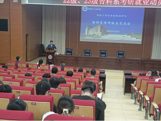 大会伊始,谭平副院长首先登台,为在场学子作考研形势与政策分析的主旨报告。谭院长结合详实的数据与生动的案例,深入剖析了当前全国考研的宏观趋势、本专业领域的广阔前景以及学院近年来的考研成果。他强调,在当前国家大力发展智能制造的战略背景下,智能科学与技术专业的学生迎来了前所未有的机遇,攻读研究生是深化专业知识、提升核心竞争力、服务国家战略需求的重要途径。谭院长的报告高屋建瓴,不仅扫清了同学们对于考研的迷茫与疑虑,更极大地激发了大家的升学热情与使命担当。