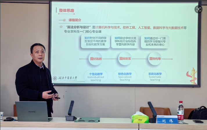 课程思政建设是新时代高校教育落实立德树人根本任务的重要举措。刘伟教授结合自己负责的《算法分析与设计》课程建设历程,从课程思政建设的背景介绍、整体思路、建设举措、建设成果四个方面分享了课程思政示范课程建设和以赛促教的经验和心得体会。刘教授首先剖析了教育部有关课程思政建设的政策和纲要,以及课程思政教学比赛与示范课程评价标准,启发老师们建设课程和参加竞赛要对标对表建设;然后分享了《算法分析与设计》课程是如何结合学校的办学定位进行“因材施教、因地制宜、因势利导”的设计与课程内容整合、思政元素提炼,做到课程思政润物细无声。最后,老师们与刘教授就课程思政如何与学校办学定位相结合凝炼课程特色等问题进行了深入交流。此次报告对学院在课程思政教学及课程建设方面起到重要的指导和促进作用。