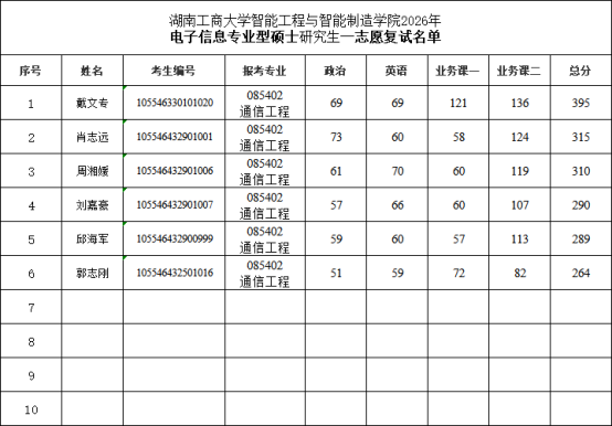 根据《湖南工商大学智能工程与智能制造学院2026年硕士研究生复试录取工作方案》,现将复试名单公布如下。